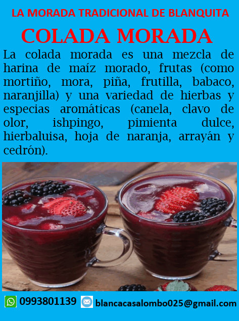 La colada morada es una mezcla de harina de maíz morado, frutas (como mortiño, mora, piña, frutilla, babaco, naranjilla) y una variedad de hierbas y especias aromáticas (canela, clavo de olor, ishpingo, pimienta dulce, hierbaluisa, hoja de naranja, arrayán y cedrón).