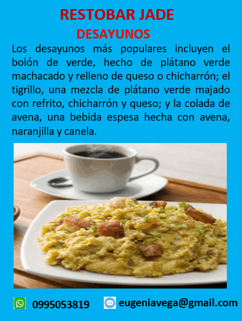 Los desayunos más populares incluyen el bolón de verde, hecho de plátano verde machacado y relleno de queso o chicharrón; el tigrillo, una mezcla de plátano verde majado con refrito, chicharrón y queso; y la colada de avena, una bebida espesa hecha con avena, naranjilla y canela.